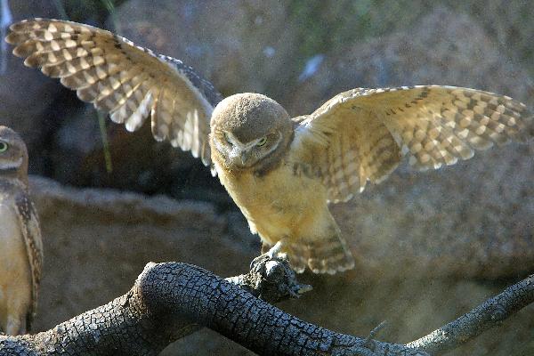| This owl was actually trying to scare away a tortoise that was getting to close to her nest. She was a riot and even though the cage had thick webbing I had to grab a shot. | ![]() ![]() ![]() |
