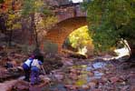 | We stopped at the most famous bridge in Zion, built by guy who ran out of government money and then used his own money until he went bankrupt. Truly a labor of love. I was rewarded by some shots of my fellow imagers, here using a view camera | |